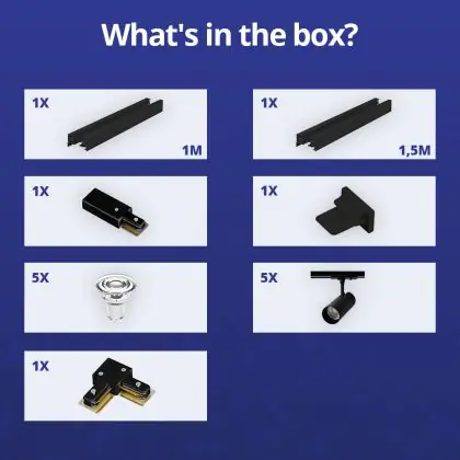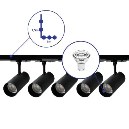 Descrizione Bright Choice Set completo 1-Fase Rail L 1 x 1,5 Metro Nero | incl. 5x Faretti + GU10 2700K 3W Dimmerabile + Tappo Di Chiusura, Connettore di Alimentazione e L -Connettore