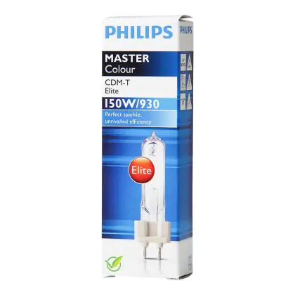Le Philips CDM-T Elite 150W 930 G12 (MASTERColour) sono lampade a scarica compatte da 150W con base G12. Queste lampade a scarica presentano una vita media di 12.000 ore, più lunga delle normali Philips CDM-T e sono caratterizzate da un'elevata efficienza energetica. La resa dei colori é eccezionale grazie all'indice di resa cromatica di 90-100Ra: questo sta ad indicare che le caratteristiche degli oggetti illuminati sono poste in risalto in maniera ottimale. Sono inoltre dotate di un filtro UV che limita di molto lo scolorimento degli oggetti illuminati. Un'altra proprietà da sottolineare é l'intensità del flusso luminoso: ben 15000 lumen.
